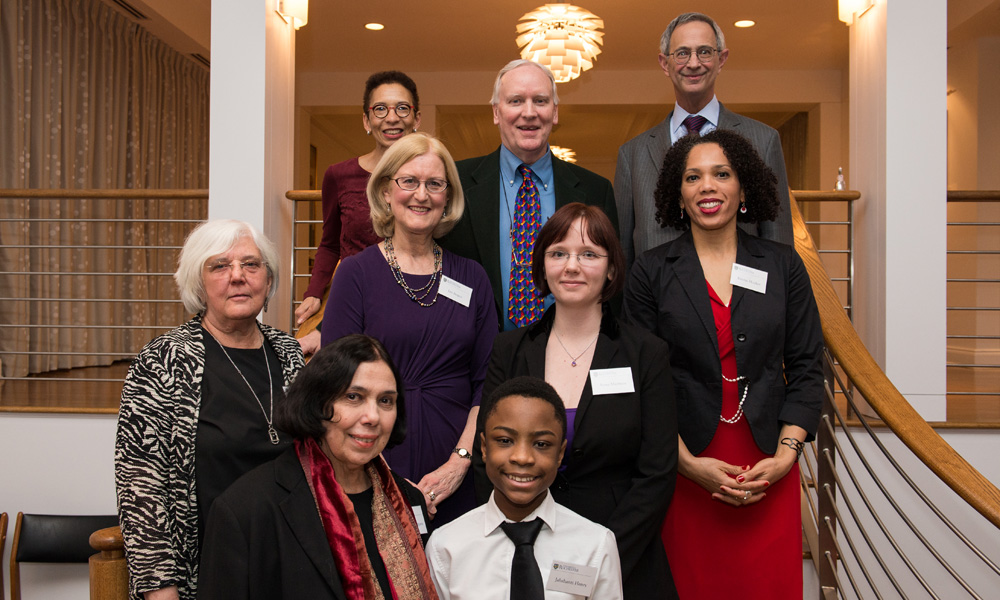 Top, left to right: University Vice Provost for Faculty Development and Diversity Vivian Lewis; Howard Potter, director of the Eastman Community Music School; President Joel Seligman; middle, l-r: Ruth Cahn, senior instructor of percussion; Diversity Award winner Jan Angus of Eastman Pathways; Anna Maimine of the Eastman School of Music; Diversity Award winner and organization development specialist Kristin Hocker; front: Carrol Frangipane, Eastman Pathways mentor and instructor of voice; and flutist Jahshanti Henry; at the Witmer House after the presentation of the Presidential Diversity Awards.